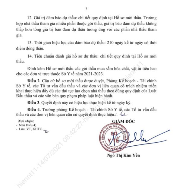 Ở thành phố Đà Nẵng, Giám đốc Sở Y tế Ngô Thị Kim Yến ký quyết định “phê duyệt hồ sơ mời thầu các gói thầu mua sắm hóa chất, vật tư tiêu hao cho các đơn vị trực thuộc Sở Y tế năm 2021 – 2023” ngày 13/7/2021. Thời gian bắt đầu tổ chức lựa chọn nhà thầu vào quý III/2021.