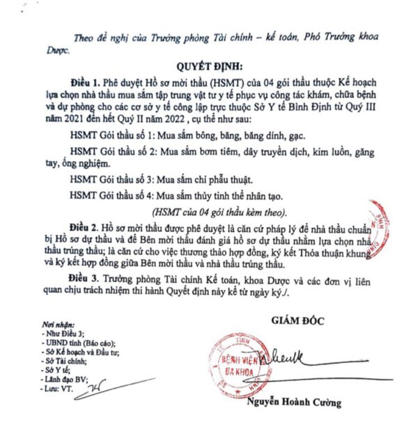 Ở tỉnh Bình Đình, quyết định phê duyệt hồ sơ mời thầu 4 gói “mua sắm tập trung vật tư y tế phục vụ công tác khám, chữa bệnh và dự phòng cho các cơ sở y tế công lập trực thuộc Sở Y tế Bình Định từ quý III năm 2021 đến hết quý II năm 2022” do Giám đốc Bệnh viện Đa khoa tỉnh Nguyễn Hoành Cường ký ngày 31/5/2021. Trong đó, gói thầu số 4 mua sắm thủy tinh thể nhân tạo gồm 25 mặt hàng, trị giá 37.040.000.000 đồng. Bảng phạm vi cung cấp và yêu cầu kỹ thuật, trong đó “Quy cách kỹ thuật/đóng gói” nêu nhãn hiệu sản phẩm của hãng sản xuất với các tiêu chuẩn đặc trưng, cũng là dấu hiệu chỉ định thầu.