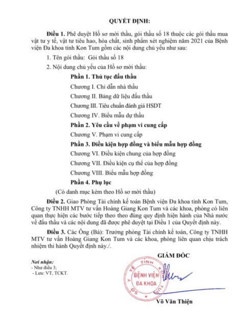 Còn ở tỉnh Kon Tum, “Hồ sơ mời thầu, gói thầu số 18 thuộc các gói thầu mua vật tư y tế, vật tư tiêu hao, hóa chất, sinh phẩm xét nghiệm năm 2021 của Bệnh viện Đa khoa tỉnh Kon Tum” được Giám đốc Võ Văn Thiện ký ngày 13/8/2021. Phụ lục kèm theo hồ sơ mời thầu là “Danh mục hàng hóa” nêu tên 138 mặt hàng với số lượng cụ thể nhưng đều không có tiêu chuẩn kỹ thuật.