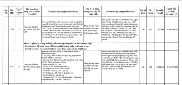 Sản phẩm mã số V43, ban đầu có tên “Thủy tinh thể nhân tạo SDHB, kèm phụ kiện” sau sửa đổi thành “Thủy tinh thể nhân tạo, mềm, đơn tiêu, chất liệu Acrylic không ngậm nước”. Tiêu chuẩn kỹ thuật sau sửa đổi: “Thủy tinh thể mềm, đơn tiêu. Thiết kế 1 mảnh. Optic dạng Phi cầu. Chất liệu Acrylic ngậm nước ≥ 25% tương đương…”. Rõ ràng, tên gọi là sản phẩm không ngậm nước nhưng tiêu chuẩn kỹ thuật lại nêu ngậm nước ≥ 25% là mâu thuẫn. Cho nên quyết định đính chính đã sửa lại tiêu chuẩn kỹ thuật: “Thủy tinh thể mềm, đơn tiêu. Thiết kế 1 mảnh. Optic dạng Phi cầu. Chất liệu Acrylic không ngậm nước hoặc tương đương…”.