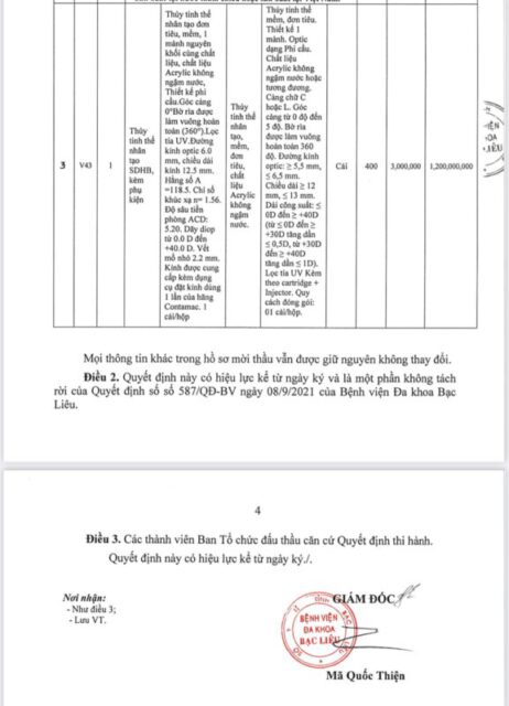 Như đã phản ánh, Quyết định về việc sửa đổi hồ sơ mời thầu số 587/QĐ-BV của Bệnh viện Đa khoa tỉnh Bạc Liêu do Giám đốc Mã Quốc Thiện ký ngày 8/9/2021. Các nội dung sửa đổi liên quan 7 sản phẩm hàng hóa với mã số V41, V42, V43, V75, V253, V254, V255.