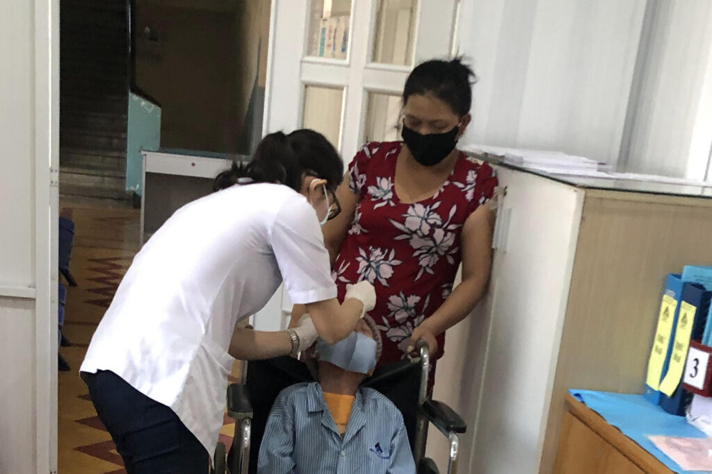 Gần 7 giờ, chị đảo vào các buồng nhắc người bệnh lên phòng điều trị. Hầu hết người bị bệnh về mắt nhìn không còn rõ, thậm chí không còn thấy gì nên sinh hoạt, đi lại rất khó khăn. Giữa mùa dịch bệnh hạn chế thăm nuôi, vài người thăm nuôi cũng lúng túng. Gặp trường hợp lúng túng, chị xáp vô giúp đỡ sắp xếp đồ dùng, dẫn đường đi khám bệnh.