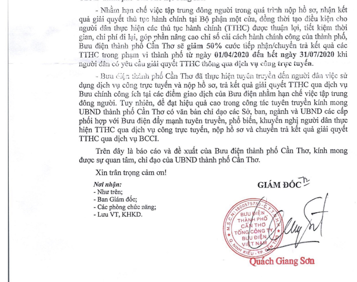 Công văn do Giám đốc Bưu điện thành phố Cần Thơ – Quách Giang Sơn ký, về việc đẩy mạnh dịch vụ công trực tuyến và tiếp nhận, trả kết quả dịch vụ BCCI đề phòng lây lan dịch Covid-19. Theo đó, “Bưu điện thành phố Cần Thơ giảm 50% cước tiếp nhận/chuyển trả kết quả các thủ tục hành chính trong phạm vi thành phố từ ngày 1/4 đến hết ngày 31/7/2020 khi người dân có yêu cầu giải quyết thủ tục hành chính thông qua dịch vụ công trực tuyến”.