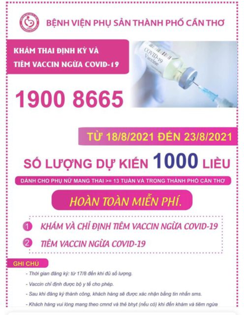 Thời gian tiêm dự kiến từ ngày 18/8 đến 23/8/2021, điểm chính tập trung tại Bệnh viện Phụ sản thành phố Cần Thơ. Dành cho phụ nữ mang thai từ 13 tuần trở lên, ở thành phố Cần Thơ. Vắc xin chỉ định được Bộ Y tế cho phép, hiện tại là vắc xin Moderna, số lượng dự kiến 1.000 liều. Hoàn toàn miễn phí.