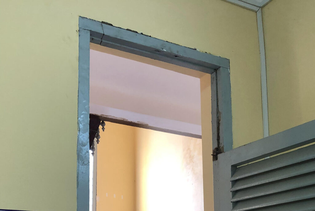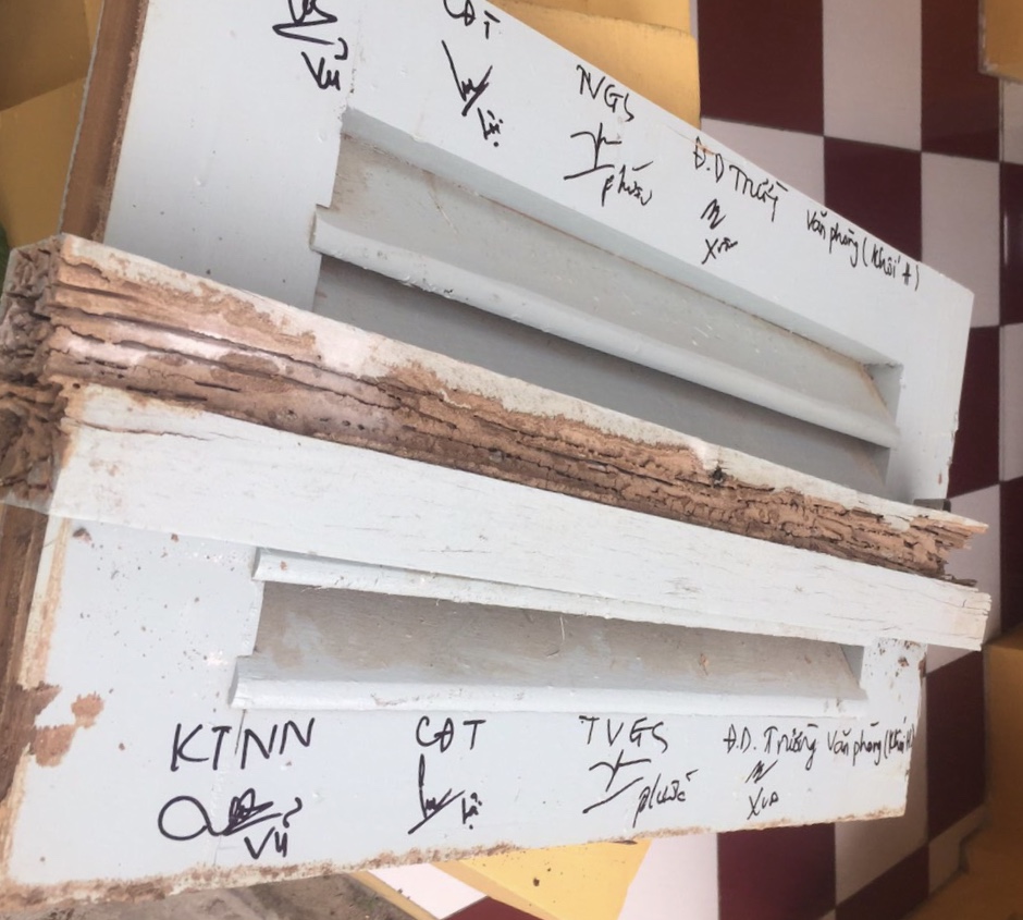 Phần gỗ trên cao khi lấy ra đã bị mối đục nát bên trong. Đại diện Chủ đầu tư, Kiểm toán Nhà nước, Tư vấn giám sát và Nhà trường cùng ký tên trực tiếp vào phần gỗ lấy đi. Khung cửa còn lại, khi phóng viên đến vẫn thấy nhiều vệt mối đục sâu cho thấy bên trong đã rệu nát và chưa biết mối xông tới đâu.