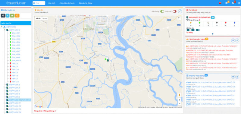 Giám sát theo dõi tình trạng hệ thống: người dùng có thể theo dõi trạng thái hoạt động các tủ điều khiển thông minh, các bộ đèn LED trên bản đồ số theo thời gian thực