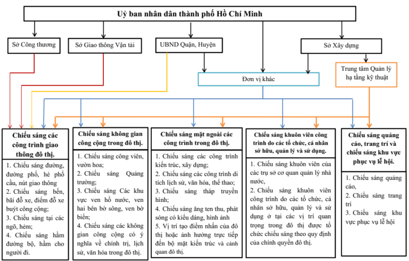 Ho Chi Minh City (HCMC) is the largest and most population urban area in Vietnam, consisting of 21 districts and townships, and 01 city. HCMC has been built and developed through various historical periods. This results in a lack of synchronisation and an inability of the urban infrastructure, particularly the public lighting system , to keep up with the rapid urbanisation rate and increasing demand of the city. The goal is for HCMC to become a smart city by 2025, hence, building a program to develop an artificial lighting system and smart lighting for the city is a pressing issue at the present.