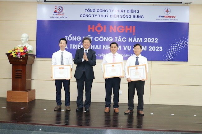 Dịp này, các tập thể và cá nhân có thành tích xuất sắc trong phong trào thi đua năm 2022 đã được trao tặng các danh hiệu thi đua, khen thưởng của EVN, EVNGENCO2 và Công ty Thuỷ điện Sông Bung.