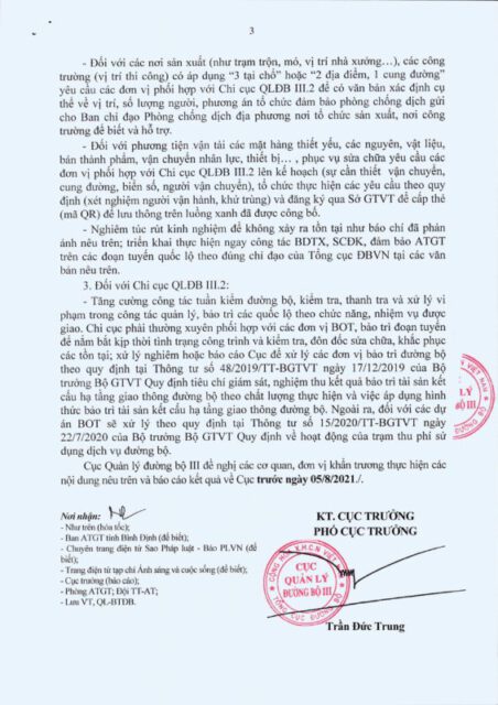 Cục QLĐB III yêu cầu các đơn vị liên quan thực hiện các hoạt động tổ chức kế hoạch, triển khai phương án trung tu, sửa chữa, khắc phục phải được thực hiện nghiêm và nhanh chóng, hoàn thành báo cáo trước ngày 5/8/2021.