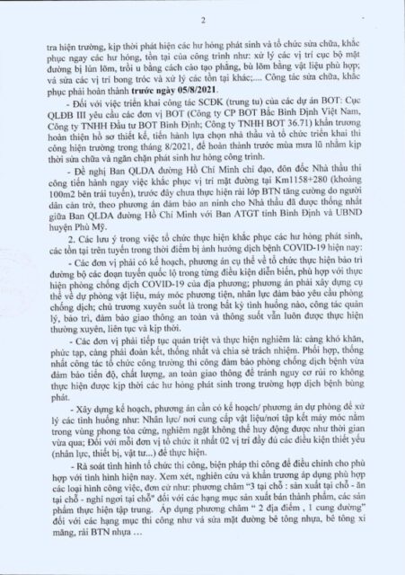 Ngày 31-7, Tổng cục đường bộ Việt Nam – Cục quản lý đường bộ III đã ban hành công văn khẩn số 1418/CQLĐBIII-QLBTBĐ về việc tăng cường thực hiện công tác quản lý, BDTX và khẩn trương triển khai SCĐK (trung tu) của các dự án đầu tư theo hình thức hợp đồng BOT trên các đoạn tuyến QL.1, QL.1D, QL.19 thuộc địa bàn tỉnh Bình Định.