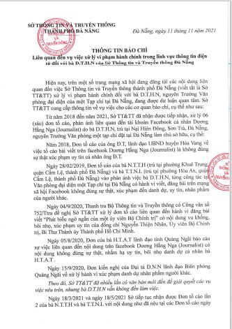 Thông cáo cho hay, hiện nay trên một số trang mạng xã hội đang đăng tải các nội dung liên quan đến việc Sở TT&TT xử lý vi phạm hành chính đối với bà D.T.H.N, nguyên Trưởng Văn phòng đại diện của một Tạp chí tại Đà Nẵng. Về việc này, Sở TT&TT cung cấp thông tin về vụ việc cho các cơ quan báo chí.