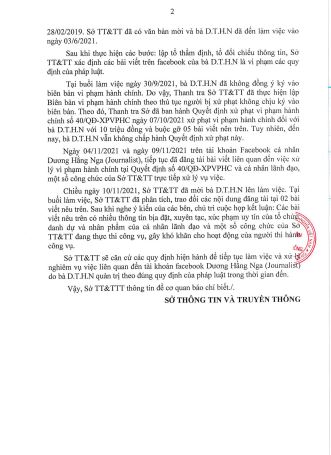 Ngày 11/11/2021 liên quan đến D.T.H.N, chủ tài khoản Facebook “Dương Hằng Nga (Journalist) nguyên Trưởng văn phòng đại diện của một Tạp chí có văn phòng tại Đà Nẵng. Sở TT&TT TP Đà Nẵng có thông cáo báo chí về việc xử lý vi phạm hành đối với bà Nga.