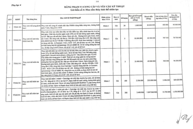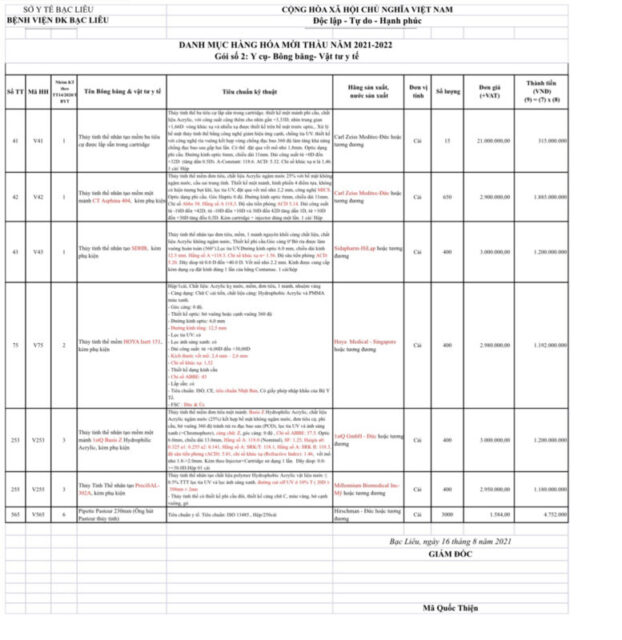 Đơn cử, số thứ tự 42, vật tư y tế là Thủy tinh thể nhân tạo mềm một mảnh CT Asphina 404 của hãng Carl Zeiss Meditec-Đức, số lượng 15 cái, đơn giá 21 triệu đồng, thành tiền 325 triệu đồng. Tương tự, số thứ tự 43 là Thủy tinh thể nhân tạo SDHB của hãng Sidapharm-HiLạp, số lượng 400 cái, đơn giá 3 triệu đồng, thành tiền 1.200 triệu đồng. Số thứ tự 75, Thủy tinh thể mềm HOYA Isert 151 của hãng Hoya Medical-Singapore, số lượng 400 cái, đơn giá 2,98 triệu đồng, thành tiền 1.192 triệu đồng.