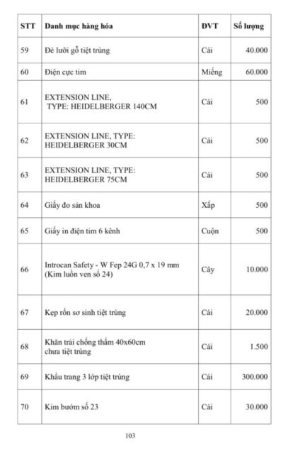 Tên riêng hàng hóa được nêu, đơn cử ở trang 103: EXTENSION LINE, TYPE: HEIDELBERGER 75CM, 500 cái. EXTENSION LINE, TYPE: HEIDELBERGER 30CM, 500 cái. EXTENSION LINE, TYPE: HEIDELBERGER 75CM, 500 cái. Introcan Safety – W Fep 24G 0,7 x 19 mm (Kim luồn ven số 24), 10.000 cây. Kẹp rốn sơ sinh tiệt trùng, 20.000 cái. Khăn trải chống thấm 40x60cm chưa tiệt trùng, 1.500 cái. Khẩu trang 3 lớp tiệt trùng, 300.000 cái….