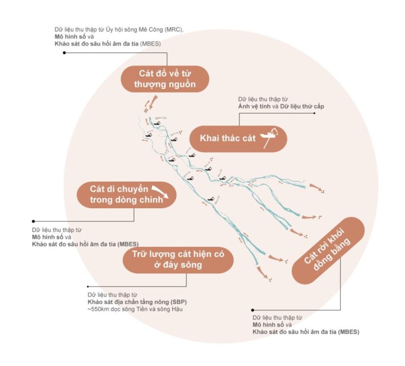 Để tính được trữ lượng cát hiện có ở đáy sông, nhóm nghiên cứu đã tiến hành đo đạc ở tâm trên chiều dài khoảng 550km dọc sông Tiền và sông Hậu bằng kỹ thuật đo đạc địa chấn tầng nông, lấy mẫu trầm tích bề mặt đáy sông. Ngoài ra, dữ liệu địa hình đáy sông từ đo sâu hồi âm đa tia, dữ liệu lỗ khoan địa chất do các tỉnh cung cấp để kiểm tra độ tin cậy của tính toán. Kết quả, đầu nguồn sông Tiền và Cổ Chiên có trữ lượng cát cao nhất, tiếp theo là sông Hậu. Trữ lượng cát thấp hơn đáng kể ở hạ nguồn sông Mekong và sông Hàm Luông. Tổng trữ lượng cát của ĐBSCL ước tính khoảng 367-550 triệu m3, chủ yếu dựa trên lớp cát di động.