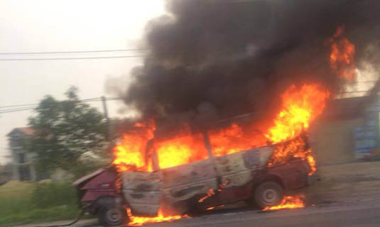 Vụ tai nạn xảy ra lúc 5 sáng nay (21/9) trên Quốc lộ 1A, đoạn tổ dân phố 1, phường Đậu Liêu, thị xã Hồng Lĩnh ,Hà Tĩnh, khiến hai vợ chồng chủ xe nguy kịch,… chiếc xe bị cháy trơ khung.