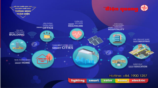Để đạt được thành công trong việc xây dựng Thành phố thông minh, Điện Quang đã cho ra đời các giải pháp công nghệ cho nhiều lĩnh vực như dân dụng, y tế, đường phố, thể thao, sân bay, cao ốc… Đồng thời Điện Quang cũng không ngừng cải tiến – phát triển giải pháp để đáp ứng nhu cầu ngày càng cao của xã hội. Hiện nay, nhiều giải pháp chiếu sáng của Điện Quang đã được ứng dụng rộng rãi từ các dự án, công trình đến thành phố, đô thị mang tầm quốc gia như Đường hầm Mũi Trâu (Đà Nẵng); Chiếu sáng đường phố, chiếu sáng tượng đài Chiến Thắng (TP. Long Khánh, Đồng Nai); Chiếu sáng đường phố quốc lộ 56 (Bà Rịa-Vũng Tàu); Chiếu sáng đường đi bộ dọc Sông Hương (TP Huế), chiếu sáng thông minh cho tòa nhà Aurora (TP.HCM), Hệ thống chiếu sáng công cộng thông minh sử dụng LED ở Khu Công nghệ cao (TP.HCM)….