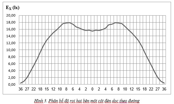 Bước 2. Căn cứ vào số liệu của bảng 2, ta vẽ được phân bố độ rọi của một bộ (cột) đèn dọc theo đường (Hình 3)