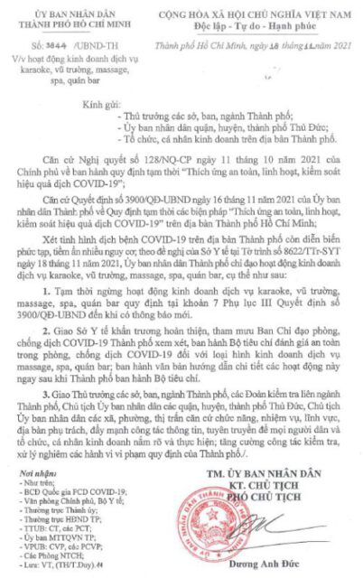 Ngày 18-11, Phó Chủ tịch UBND TP.HCM Dương Anh Đức đã ký văn bản về việc tạm ngừng hoạt động kinh doanh dịch vụ karaoke, vũ trường, massage, spa, quán bar.