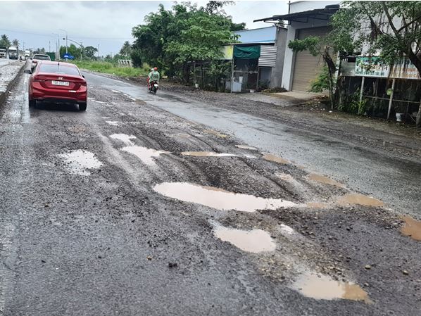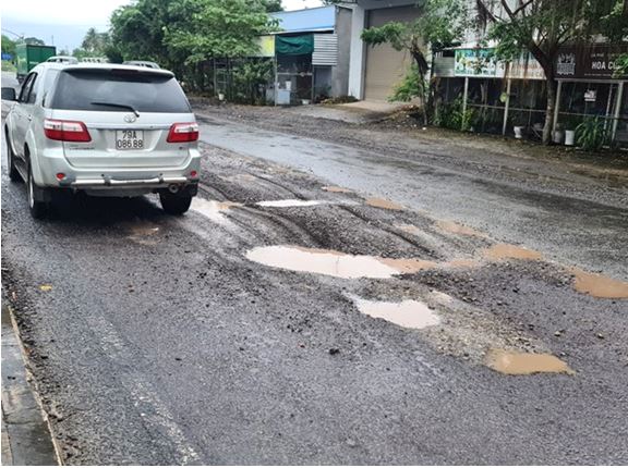 Cũng tại Km1420+550 ( Thanh Châu, Ninh Giang, huyện Ninh Hòa, tỉnh Khánh Hòa), nhiều ổ gà, đá dăm bị bong tróc xe máy qua lại rất dễ bị trượt ngã.