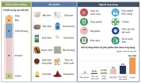 TS Dũng phân tích, phụ phẩm tôm chứa nhiều protein có thể sản xuất nhiều sản phẩm có giá trị gia tăng cao. Đặc biệt, vỏ tôm chứa 27% chitin là nguyên liệu để sản xuất những sản phẩm có rất nhiều ứng dụng trong nhiều lĩnh vực khác nhau. Thế nhưng, ông Phan Thanh Lộc, Phó chủ tịch HĐQT Công ty cổ phần Việt Nam Food (VNF) cho biết, phụ tôm hiện mới xử lý được khoảng 40% (7% làm thực phẩm và dược phẩm, 33% làm phân bón và thức ăn chăn nuôi cấp thấp), còn lại 60% xả bỏ vào môi trường. Tính ra mỗi năm có hàng trăm nghìn tấn bỏ phụ phẩm tôm trở thành rác thải, gây hại môi trường.