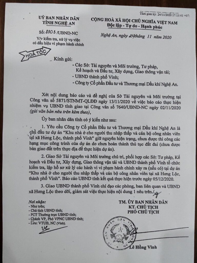 Ngày 24/11/2020 UBND tỉnh Nghệ An đã ra công văn 8303/ UBND- NC yêu cầu Công ty Cổ phần Đầu tư và Thương mại Dầu khí Nghệ An giữ nguyên hiện trạng, chưa được thi công các hạng mục công trình của dự án do chưa hoàn thành thủ tục đất đai, đồng thời giao Sở Tài nguyên và Môi trường Nghệ An cùng các bên liên quan tổ chức kiểm tra, lập hồ sơ xử lý các hành vi vi phạm hành chính xảy ra (nếu có) tại Dự án Hưng Lộc.