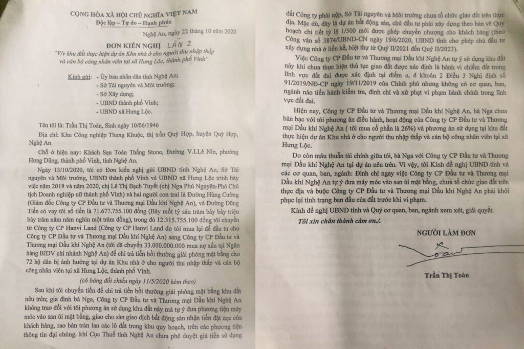 Tại các đơn kiến nghị, bà Trần Thị Toàn khẳng định bà đã đầu tư tiền để Công ty cổ phần Đầu tư và Thương mại Dầu khí Nghệ An thực hiện dự án (vì Công ty CP Dầu khí Nghệ An không có khả năng thực hiện do đang công nợ xấu tại ngân hàng BIDV chi nhánh Nghệ An), bà cũng đề nghị Sở, ngành buộc Công ty Cổ phần Đầu tư và Thương mại Dầu khí Nghệ An giữ nguyên hiện trạng và xử phạt hành vi tự ý sử dụng khu đất khi chưa được cấp thẩm quyền giao đất trên thực địa.