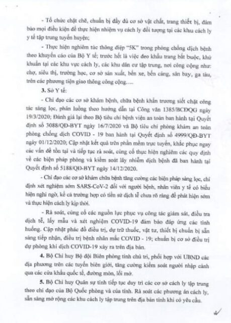 2. Bộ Chỉ huy Quân sự tỉnh tiếp tục duy trì các cơ sở cách ly tập trung theo chỉ đạo của Bộ Quốc phòng và của tỉnh. Rà soát các phương án cách ly, sẵn sàng mở rộng các khu cách ly tập trung trên địa bản tỉnh khỉ có yêu cầu.