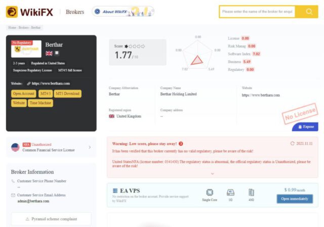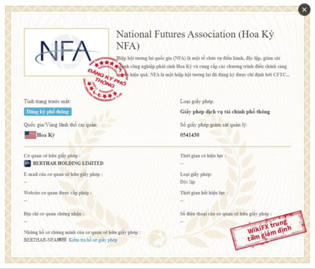 Khi tìm kiếm sàn BERTHAR trên website www.wikifx.com, ta thấy rõ sàn được chấm 6.92, nhiều chỉ số được đánh giá cao ví dụ như chỉ số kiểm soát rủi ro lên đến 8.22 điểm. Ngoài ra giấy phép của sàn này được WIKIFX công bố là được cung cấp bởi tổ chức National Futures Association (Hoa Kỳ NFA) và đang được WIKIFX giám định về giấy phép.