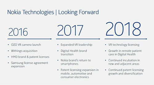 Cụ thể, năm 2017 Nokia sẽ mở rộng các đối tác thực tế ảo (VR), tăng thêm các bằng sáng chế về di động, công nghệ tự động, điện tử tiêu dùng và thiết bị chăm sóc sức khoẻ. Cùng với đó là kế hoạch trở lại sân chơi di động với loạt smartphone mới.