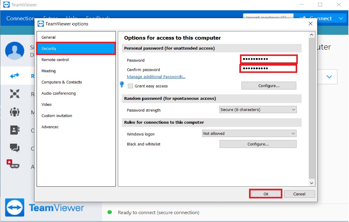 Lưu ý Password sẽ đổi khi TeamViewer khởi động lại nên để tiện lợi có thể cài đặt Password cố định trong mục Extras > Options > Security.