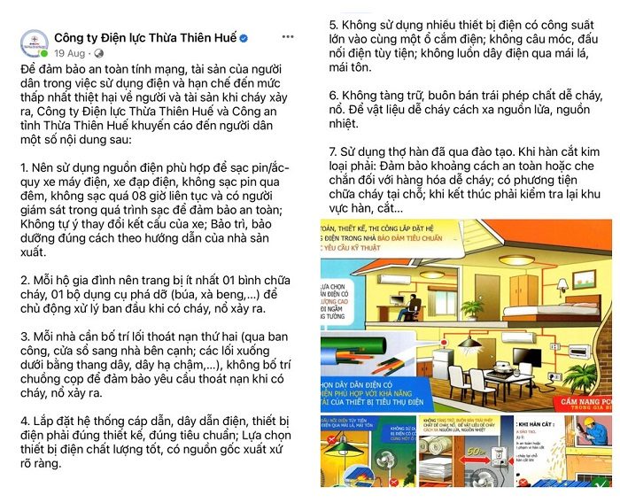 Nhằm đảm bảo an toàn tính mạng, tài sản của người dân trong việc sử dụng điện và hạn chế đến mức thấp nhất thiệt hại về người và tài sản khi cháy xảy ra, PC T.T.Huế và Cảnh sát PCCC Công an tỉnh T.T.Huế đã phối hợp tuyên truyền các khuyến cáo PCCC và công tác an toàn trong sử dụng điện đến từng người dân qua nhiều kênh như ZaloOA, ứng dụng EVNCPC CSKH, Fanpage Facebook, Trang tin điện tử Công ty với các nội dung ngắn gọn, dễ hiểu, dễ thực hiện kèm theo hình ảnh minh họa trực quan.