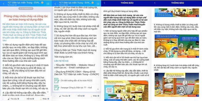 Nhằm đảm bảo an toàn tính mạng, tài sản của người dân trong việc sử dụng điện và hạn chế đến mức thấp nhất thiệt hại về người và tài sản khi cháy xảy ra, PC T.T.Huế và Cảnh sát PCCC Công an tỉnh T.T.Huế đã phối hợp tuyên truyền các khuyến cáo PCCC và công tác an toàn trong sử dụng điện đến từng người dân qua nhiều kênh như ZaloOA, ứng dụng EVNCPC CSKH, Fanpage Facebook, Trang tin điện tử Công ty với các nội dung ngắn gọn, dễ hiểu, dễ thực hiện kèm theo hình ảnh minh họa trực quan.