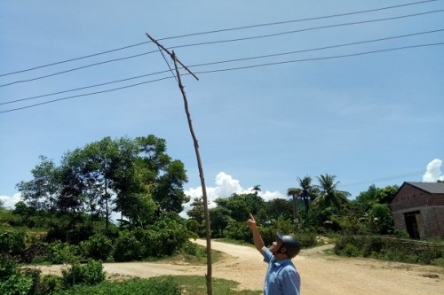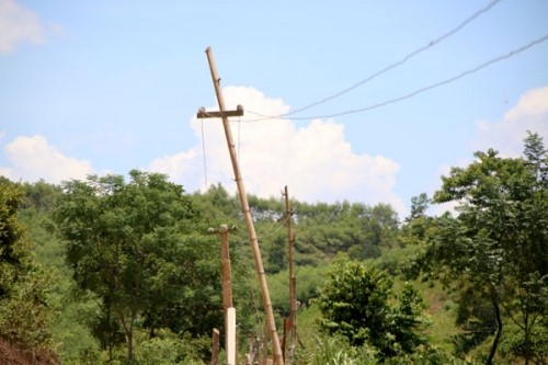 Ông Vi Văn Chiến chỉ tay ra cột điện gãy trên trục đường chính xóm, gần nhà mình nói: “Cột điện này bị xe ô tô đi qua làm đổ gãy hơn hai tuần trước, dây điện trần sà xuống gần mặt đường nên người dân ở đây phải buộc tạm cây tràm chống lên cho người và xe qua lại. Gió lớn một tý là cây cột tạm này lại trở nên xiêu vẹo và đổ liền.”