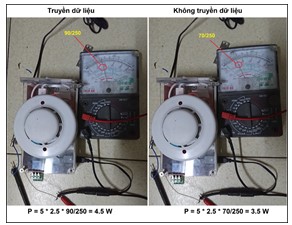 Công suất tiêu thụ của thiết bị được đo bằng cách sử dụng một đồng hồ đo điện đo dòng tiêu thụ tổng của thiết bị. Kết quả đo ở hai trạng thái, khi thiết bị đang hoạt động nhưng không gửi dữ liệu và khi thiết bị đang gửi dữ liệu về máy tính. Có thể thấy kết quả trên hình 12 và bảng 2 bên dưới.