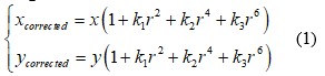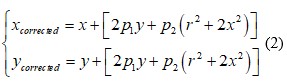 Trong đó, (x, y) là tọa độ điểm ảnh gốc chịu ảnh hưởng của méo dạng xuyên tâm. Còn (xcorrected, ycorrected) là tọa độ đúng của điểm ảnh (đã được loại bỏ méo dạng).