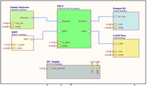 Cảm biến phát hiện khói và cảm biến nhiệt độ, độ ẩm được kết nối với một mạch điện tử khác chứa vi điều khiển STM32, vi điều khiển đọc giá trị cảm biến sau đó chuyển dữ liệu về Raspberry thông qua giao tiếp USB.
