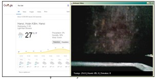 Cho thiết bị hoạt động liên tục và đặt trong không gian ngoài trời. Mục đích là khi thu tín hiệu nhiệt độ độ ẩm từ cảm biến ta có thể đem so sánh với dữ liệu thời tiết của các trạm quan trắc lấy từ weather.com. Hình 10 và bảng 1 bên dưới mô tả một kết quả đo kiểm tra và so sánh với kết quả đo từ weather.com.
