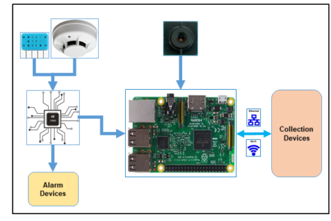 Với mô hình hệ thống như trên, ta có thể thấy vai trò của RPi chủ yếu nằm ở hai chức năng là thu thập dữ liệu và truyền đi. Thu thập dữ liệu chính là việc giao tiếp với khối camera và khối cảm biến khói. Trong thiết kế phần cứng giải pháp được chọn cho hai kết nối này đều là USB, nên việc giao tiếp với hai cảm biến sẽ thông qua driver USB. Sau đó nhiệm vụ quan trọng tiếp theo đó là truyền dữ liệu về trung tâm giám sát.