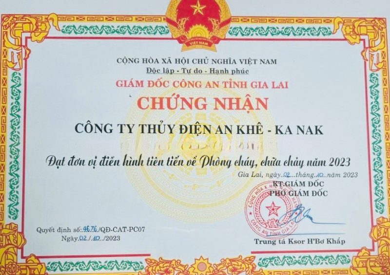 Chiều ngày 04/10/2023, Công ty Thủy điện An Khê – Ka Nak (AKKN) vinh dự được Công an tỉnh Gia Lai biểu dương khen thưởng là đơn vị điển hình tiên tiến trong phong trào toàn dân phòng cháy và chữa cháy (PCCC) năm 2023 nhân kỷ niệm 62 năm Ngày truyền thống lực lượng PCCC-CNCH (4/10/1961-4/10/2020) và 22 năm Ngày toàn dân PCCC (4/10/2001 – 4/10/2023).