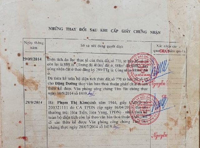 Trong đơn kêu cứu gửi đến chính quyền địa phương và các cơ quan chức năng, bà Kim cho biết: “Gia đình tôi được Nhà nước cấp cho sử dụng thửa đất số 275, tờ bản đồ số 15, diện tích 509m2 (GCNQSDĐ số B371629 do UBND huyện hòa Vang cấp 29/09/2014) và thửa đất số 121, tờ bản đồ số 17, diện tích 507m2 (GCNQSDĐ số B371625 do UBND huyện Hòa Vang cấp 29/09/2014). Từ trước tới nay, gia đình tôi vẫn canh tác ổn định trên các thửa đất và thực hiện đầy đủ nghĩa vụ sử dụng đấtvới Nhà nước. Ngày 24/12/2020, gia đình tôi phát hiện một đơn vị đưa máy vào đào hố sâu xâm phạm làm biến dạng mảnh đất và hủy hoại hoàn toàn hoa màu trên diện tích của chúng tôi mà không thông báo lý do. Gia đình đã đến hiện trường, yêu cầu đơn vị trên dừng thi công, đồng thời báo cáo Lãnh đạo thôn An Trạch và UBND xã Hòa Tiến. Ngày 19/3/2021, chúng tôi tiếp tục phát hiện nhà thầu đang thi công nền đường trên phần đất của gia đình tôi”.