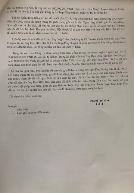 Tôi chỉ nhận được tiền cam kết đến cuối năm 2019, Hợp đồng hết thời hạn cũng không được quyết toán tiền gốc, trong khi hàng tháng tôi phải trả nợ gốc và lãi cho Ngân hàng số tiền gần 15 triệu đồng. Quá mệt mỏi vì chờ đợi, tôi xin rút vốn đầu tư, do không nhận được quyền lợi như cam kết. Nhưng mặc dù đã liên hệ nhiều lần qua tin nhắn, điện thoại, kể cả gặp trực tiếp với ông Hán Hữu Hải, tôi đều chỉ nhận được các lý do khác nhau cho việc trì hoãn.