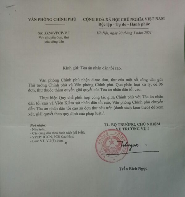 Công văn của Văn phòng Chính phủ số 3324/VPCP-V.I ngày 20/5/2021 có nội dung: “Văn phòng Chính phủ nhận được đơn, thư của một số công dân gửi Thủ tướng Chính phủ và Văn phòng Chính phủ. Qua phân loại xử lý, có 6 đơn, thư thuộc thẩm quyền giải quyết của TAND tối cao. Thực hiện Quy chế phối hợp công tác giữa Chính phủ với TAND tối cao và VKSND tối cao, Văn phòng Chính phủ chuyển đến TAND tối cao số đơn thư nêu trên để xem xét, giải quyết theo quy định của pháp luật”.