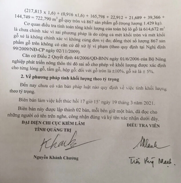 Liên quan đến lô gỗ, ngày 19/3/2021, đại diện Cơ quan điều tra VKSND tối cao làm việc với Chi cục Kiểm lâm tỉnh Quảng Trị về việc tính toán khối lượng. Biên bản làm việc cho biết, vấn đề đặt ra: Khối lượng lô gỗ 614,672 m3 (như giám định đã tính và được lấy làm căn cứ buộc tội) có đúng với quy định hay không? Căn cứ pháp luật để áp dụng? Cơ quan điều tra VKSND tối cao đề nghị Chi cục Kiểm lâm tỉnh Quảng Trị cho ý kiến.