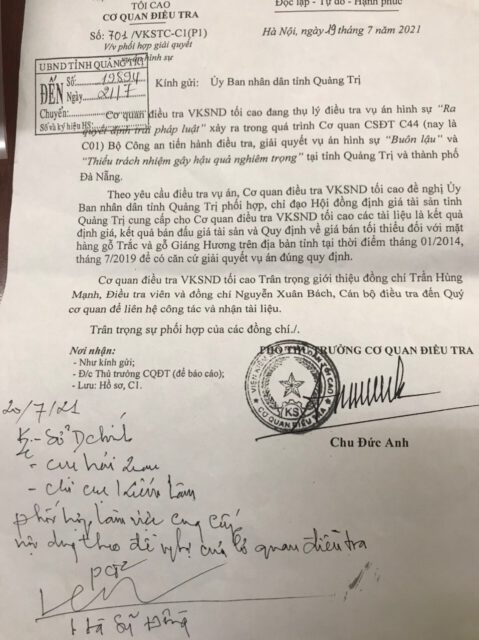 Ngày 19/7/2021, Cơ quan điều tra VKSND tối cao có Công văn số 701/VKSTC-C1(P1) gửi UBND tỉnh Quảng Trị đề nghị phối hợp giải quyết vụ án hình sự. Công văn cho biết, Cơ quan điều tra VKSND tối cao đang thụ lý điều tra vụ án hình sự “Ra quyết định trái pháp luật” xảy ra trong quá trình Cơ quan CSĐT C44 (nay là C01) Bộ Công an tiến hành điều tra, giải quyết vụ án hình sự “Buôn lậu” và “thiếu trách nhiệm gây hậu quả nghiêm trọng” tại tỉnh Quảng Trị và thành phố Đà Nẵng. Theo yêu cầu điều tra vụ án, đề nghị UBND tỉnh Quảng Trị phối hợp, chỉ đạo Hội đồng định giá tài sản tỉnh cung cấp các tài liệu là kết quả định giá, kết quả bán đấu giá tài sản và Quy định về giá bán tối thiểu đối với mặt hàng gỗ Trắc và gỗ Giáng Hương trên địa bàn tỉnh tại thời điểm tháng 1/2014, tháng 7/2019.